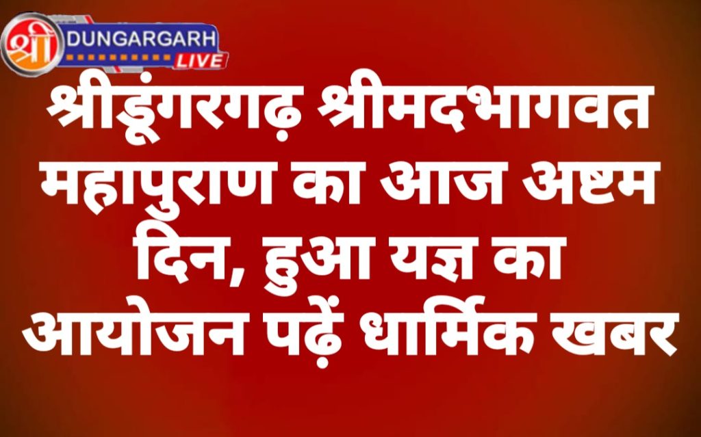 श्रीडूंगरगढ़ कालू बास शनि मंदिर के पास हरी प्रसाद श्यामसुंदर मोदी के गृह निवास में आयोजित श्रीमद भागवत महापुराण का आज अष्टम दिवस में यज्ञ का आयोजन किया गया, जिसमे राज गुरु पंडित रामदेव उपाध्याय ने वैदिक मंत्रोचारण के साथ यज्ञ आहुतियां दिलवाई, जिसमे हरी प्रसाद श्याम सुंदर, बजरंग लाल द्वारका प्रसाद देवी लाल, पवन कुमार करनी प्रताप हरिओम, जोड़े सहित यज्ञ में आहुतियां दी, तड़ उपरांत ब्रह्मण भोजन का आयोजन किया गया, जिसमे डॉक्टर लूणकरण मोदी का समस्त परिवार ने गुरुजनों को भोजन करवाया एव सूभ आशीर्वाद लिया ।