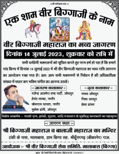 श्रीडूंगरगढ़ लाइव 13 जुलाई 2023। क्षेत्र के लोकदेवता वीर बिग्गा जी महाराज का भव्य जागरण 14 जुलाई शुक्रवार की रात्रि...
