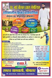 श्रीडूंगरगढ़ लाइव 23 जुलाई 2023। रात्रिकालीन क्रिकेट प्रतियोगिता के द्वितीय सीजन की शुरुआत 27 अगस्त 2023 से गांव मोमासर में...