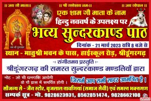 श्रीडूंगरगढ़ लाइव...20 मार्च 2023।इस हिंदू नववर्ष पर श्रीडूंगरगढ़ कस्बे में कई धार्मिक आयोजन होंगे।इसी कड़ी में कस्बे की सभी सुन्दरकाण्ड...