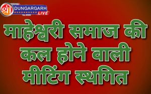 श्रीडूंगरगढ़ लाइव 29 जुलाई 2023। माहेश्वरी समाज श्रीडूंगरगढ़ की कल होने वाली आम मीटिंग को अपरिहार्य कारणों से स्थगित कर दिया...