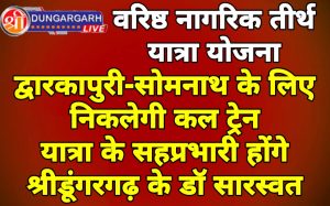 श्रीडूंगरगढ़ लाइव 12 जुलाई 2023। वरिष्ठ नागरिक तीर्थ यात्रा योजना 2023 के अंतर्गत वरिष्ठ यात्रियों को तीर्थ यात्रा कराने हेतु बीकानेर...