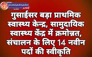 श्रीडूंगरगढ़ लाइव 16 जुलाई 2023।श्रीडूंगरगढ़ के गांव गुसाईसर बड़ा के लिये बड़ी खबर। गांव का प्राथमिक स्वास्थ्य केंद्र, सामुदायिक स्वास्थ्य...