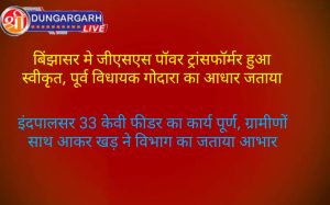 श्रीडूंगरगढ़ लाइव न्युज 1 सितंबर 2023 श्रीडूंगरगढ़ ग्राम बिंझासर में प्रथम जीएसएस का पॉवर ट्रांसफार्मर स्वीकृत हुआ हैं ग्राम वासियों...