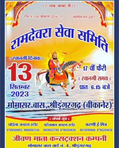 श्रीडूंगरगढ़ लाइव न्युज 4 सितंबर2023 श्रीडूंगरगढ़.कस्बे की रामदेवरा सेवा समिति मोमासर बास द्वारा रामदेवरा की सतरहवीं पैदल यात्रा 13 सितंबर...