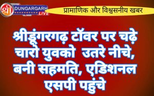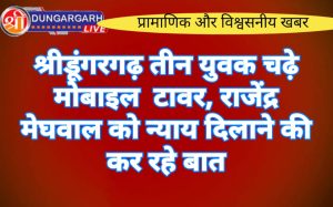 श्रीडूंगरगढ़ लाइव न्युज 5 सितंबर 2023 श्रीडूंगरगढ़ आज पूरे दिन चार युवक मोबाइल टावर पर चढ़ कर राजेंद्र मेघवाल पर...