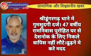 श्रीडूंगरगढ़ लाइव न्युज 8 सितंबर 2023 श्रीडूंगरगढ़ थाने मे गुमशुदगी दर्ज करवाते हुवे ओमप्रकाश पुरोहित पुत्र अर्जुनराम जाति पुरोहित निवासी...