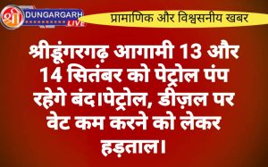 श्रीडूंगरगढ़ लाइव न्युज 9 सितंबर 2023 राजस्थान पेट्रोलियम डीलर्स एसोसिएशन की ओर से राजस्थान में पेट्रोल-डीजल पर वैट कम करने...