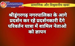 श्रीडूंगरगढ़ लाइव न्युज 10 सितंबर 2023 श्रीडूंगरगढ़ नगरपालिका के आगे पट्टो के लिये प्रदर्शन कर रहे प्रदर्शनकारी श्रीडूंगरगढ़ पहुंच रही...