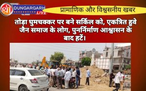 श्रीडूंगरगढ़ लाइव न्युज 14 सितंबर-2023 श्रीडूंगरगढ़ के राष्ट्रीय राजमार्ग पर स्थित घुमचक्कर को तोड़ने की खबर मिलते ही जैन समाज...