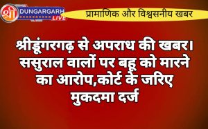 श्रीडूंगरगढ़ लाइव न्युज 16 सितंबर-2023 श्रीडूंगरगढ़ थाना क्षेत्र का मामला ससुराल वालों को बहू को मारने का आरोप लगा है।...
