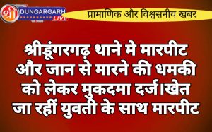 श्रीडूंगरगढ़ लाइव न्युज 19 सितंबर-2023 श्रीडूंगरगढ़ खेत जा रहीं युवती के साथ मारपीट करने और गाली गलौज को लेकर थाने...