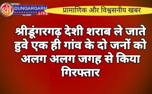 श्रीडूंगरगढ़ लाइव न्युज 20 सितंबर-2023 श्रीडूंगरगढ़ पुलिस गस्त के दौरान एक ही गांव के दो जनों को शराब ले जाते...