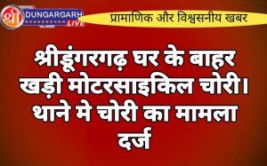 श्रीडूंगरगढ़ लाइव न्युज 24 सितंबर-2023 श्रीडूंगरगढ़ थाने मे मोटरसाइकिल चोरी का मुकदमा दर्ज करवाया नरेंद्र पुत्र सत्यनारायण वाल्मीकि मोमासर बास...