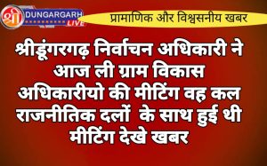 श्रीडूंगरगढ़ लाइव न्युज 5 अक्टूबर 2023 निर्वाचन अधिकारियों ने राजनीतिक दलों के साथ मीटिंग श्रीडूंगरगढ़ उपखण्ड कार्यालय में आज बुधवार...