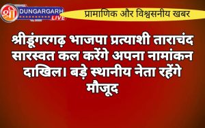 श्रीडूंगरगढ़ लाइव न्यूज़ 1 नवंबर 2023 नेता ताराचंद सारस्वत द्वारा नामांकन दाखिल करवाया जाएगा जिसको लेकर लगातार तैयारी चल रही...