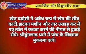 श्रीडूंगरगढ़ लाइव न्यूज़ 4 नवंबर 2023 श्रीडूंगरगढ़ खेत की अवैध रूप से सीव काटने झटका मशीन और तार उखाड़ कर...