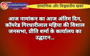 श्रीडूंगरगढ़ लाइव न्यूज़ 6 नवंबर 2023 राजस्थान विधानसभा चुनावों के नामांकन दाखिल करने का आज अंतिम दिन है। श्रीडूंगरगढ़ विधानसभा...