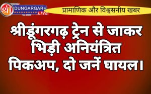 श्रीडूंगरगढ़ लाइव न्यूज़ 30दिसंबर 2023 क्षेत्र के गांव शीतलनगर के नजदीक एक पिकअप के ट्रेन से टकरा जाने से एक...