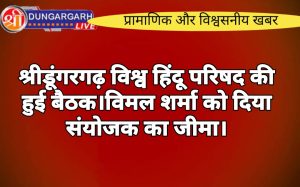 श्रीडूंगरगढ़ लाइव न्यूज 16 दिसंबर 2023 श्रीडूंगरगढ़ आज दोपहर 2 बजे विश्व हिंदू परिषद प्रखंड की बैठक जिला अध्यक्ष जगदीश...