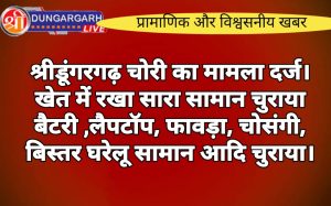 श्रीडूंगरगढ़ लाइव न्यूज़ 4 जनवरी 2024 श्रीडूंगरगढ़ थाने में चोरी का मुकदमा दर्ज करवाते हुए रतनलाल सिद्ध पुत्र बीरबल नाथ...