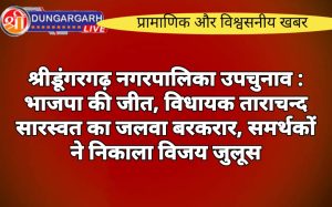 श्रीडूंगरगढ़ लाइव न्यूज़ 11जनवरी 2024 श्रीडूंगरगढ़ नगरपालिका के वार्ड 3 का उपचुनाव विधानसभा में भाजपा विधायक ताराचन्द सारस्वत की जीत...
