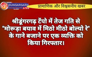 श्रीडूंगरगढ़ लाइव न्यूज़ 14 जनवरी 2024 श्रीडूंगरगढ़ पुलिस दस्त के दौरान बीदासर रोड पर एक टेंपो वाला तेज गति से...