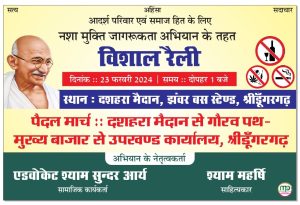 श्रीडूंगरगढ़ लाइव न्यूज़ 23 फरवरी 2024 नशा मुक्ति जागरूकता अभियान के तहत विशाल रैली का आयोजन 23 फरवरी 2024 को...