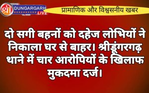 श्रीडूंगरगढ़ लाइव न्यूज़ 3 फरवरी 2024 दहेज के लिए दो विवाहिता बहनों के साथ मारपीट कर ससुराल से निकाल देने...