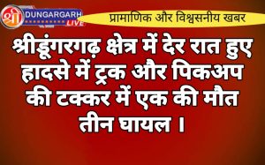 श्रीडूंगरगढ़ लाइव न्यूज़ 5 फरवरी 2024 क्षेत्र के गांव हेमासर के स्टैंड के पास रविवार शाम को सड़क हादसे में...