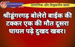 श्रीडूंगरगढ़ लाइव न्यूज़ 12फरवरी 2024 श्रीडूंगरगढ़ क्षेत्र में सुबह-सुबह एक दुखद खबर आई है बोलेरो और बाइक के टकराने से...