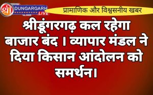 श्रीडूंगरगढ़ लाइव न्यूज़ 15 फरवरी 2024 श्रीडूंगरगढ़ किसान आंदोलन के समर्थन में कल शुक्रवार को बाजार बंद रहेगा संयुक्त किसान...