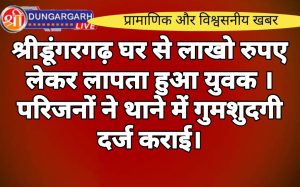 श्रीडूंगरगढ़ लाइव न्यूज़ 24 मार्च 2024 श्रीडूंगरगढ़ थाना क्षेत्र में बाना गांव निवासी मांगीलाल पुत्र मानाराम जाति जाट उम्र 46...