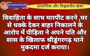 श्रीडूंगरगढ़ लाइव न्यूज़ 8 मार्च 2024 विवाहिता मारपीट से परेशान होकर अपने पीहर लौट आई व पति सहित सास के...