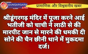 श्रीडूंगरगढ़ लाइव न्यूज़ 5 अप्रैल 2024 श्रीडूंगरगढ़ नाबालिक लड़की ने अपनी चाची पर मारपीट करने और जान से मारने की...