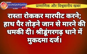 रास्ता रोककर मारपीट करने; हाथ पैर तोड़ने जान से मारने की धमकी दी। श्रीडूंगरगढ़ थाने में मुकदमा दर्ज।