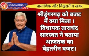 श्रीडूंगरगढ़ लाइव न्यूज़ 10जुलाई 2024 श्रीडूंगरगढ़ विधायक ताराचंद सारस्वत ने बजट पर अपनी प्रतिक्रिया देते हुए कहा कि राजस्थान का...
