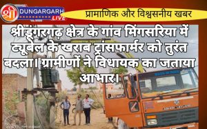 श्रीडूंगरगढ़ लाइव न्यूज़ 17 जुलाई 2024 ग्राम मिंगसरिया में करणी माता मन्दिर के पास पीएचडी के ट्यूबेल का ट्रांसफार्मर खराब...