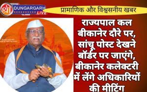 श्रीडूंगरगढ़ लाइव न्यूज़ 27 अगस्त 2024 राज्यपाल हरिभाऊ बागड़े जिले के दो दिवसीय दौरे पर बुधवार को आएंगे। राज्यपाल बागड़े...