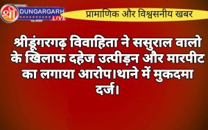 श्रीडूंगरगढ़ लाइव न्यूज़ 3 अगस्त 2024 विवाहिता को दहेज के लिए उत्पीड़न करने, मारपीट करने के आरोप में पीड़िता ने...