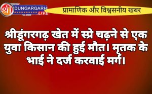 श्रीडूंगरगढ़ लाईव न्यूज 3 अगस्त 2024 घटना इंदपालसर हीरावतान निवासी सीताराम पुत्र चांदाराम मेघवाल की स्प्रे चढ़ने से पीबीएम में...