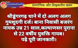 श्रीडूंगरगढ़ लाइव न्यूज़ 5 अगस्त 2024 श्रीडूंगरगढ़ स्थानीय थाने में गुमशुदगी की दो अलग-अलग रिपोर्ट दर्ज हुई है। बाना निवासी...