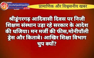 श्रीडूंगरगढ़ लाइव न्यूज़ 9 अगस्त 2024 आज आदिवासी दिवस पर राज्य सरकार की छुट्टी के बाद भी कुछ निजी स्कूल...