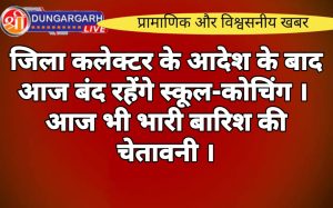 श्रीडूंगरगढ़ लाईव न्यूज 16 अगस्त 2024 जिले में अत्यधिक बारिश, अतिवृष्टि व जलभराव की स्थिति को देखते हुए शुक्रवार को...