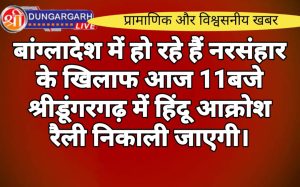 बांग्लादेश में हो रहे हैं नरसंहार के खिलाफ आज 11बजे श्रीडूंगरगढ़ में हिंदू आक्रोश रैली निकाली जाएगी।