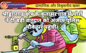श्रीडूंगरगढ़ लाइव न्यूज़16 अगस्त2024 एक बार फिर क्षेत्र में चोरों ने मचाया आतंक।श्रीडूंगरगढ़ पुलिस थाना क्षेत्र के कुंतासर गांव में...