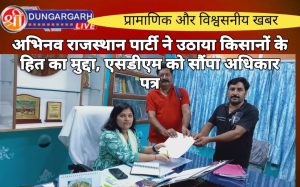 श्रीडूंगरगढ़ लाइव न्यूज़ 23 सितंबर 2024 श्रीडूंगरगढ़ एसडीएम उमा मित्तल को अभिनव राजस्थान पार्टी के कार्यकर्ता श्रवणसिंह पुण्दलसर और बलवंत...