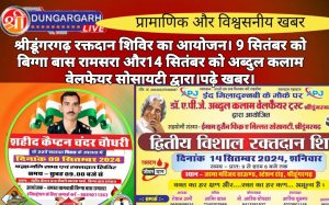 श्रीडूंगरगढ़ लाइव न्यूज़ 2 सितंबर 2024 श्रीडूंगरगढ़ कैप्टन चंद्र चौधरी के 22वे बलिदान दिवस पर आयोजित श्रद्धांजली सभा के साथ...