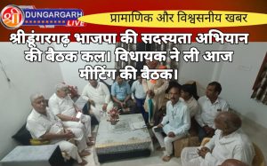 श्रीडूंगरगढ़ लाइव न्यूज़ 16 सितंबर 2024 भाजपा सदस्यता अभियान की मीटिंग कल मंगलवार को भाजपा कार्यालय श्रीडूंगरगढ़ में शाम 4...