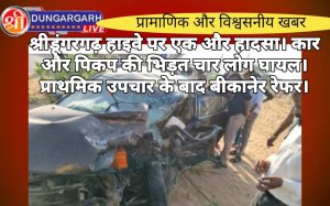 श्रीडूंगरगढ़ लाइव न्यूज़ 5 अक्टूबर 2024 श्रीडूंगरगढ़ अभी अभी मिली जानकारी के अनुसार बिग्गा के पास एक कार और पिकप...